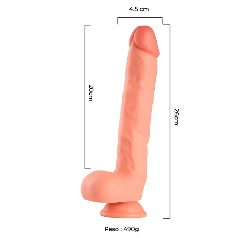 Cuenta con 26 cm de longitud total y 20 cm insertables, además de un diámetro aproximado de 4.5 cm, ofreciendo una experiencia más completa para quienes desean explorar sensaciones más intensas. Su base con ventosa permite fijarlo a superficies lisas, facilitando diferentes posiciones y mayor comodidad durante su uso.